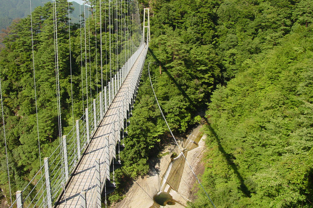 熊本県内でも最長を誇る吊り橋。落差150mの雄滝と落差100m雌滝からなる夫婦滝である白水滝を望むことができます。